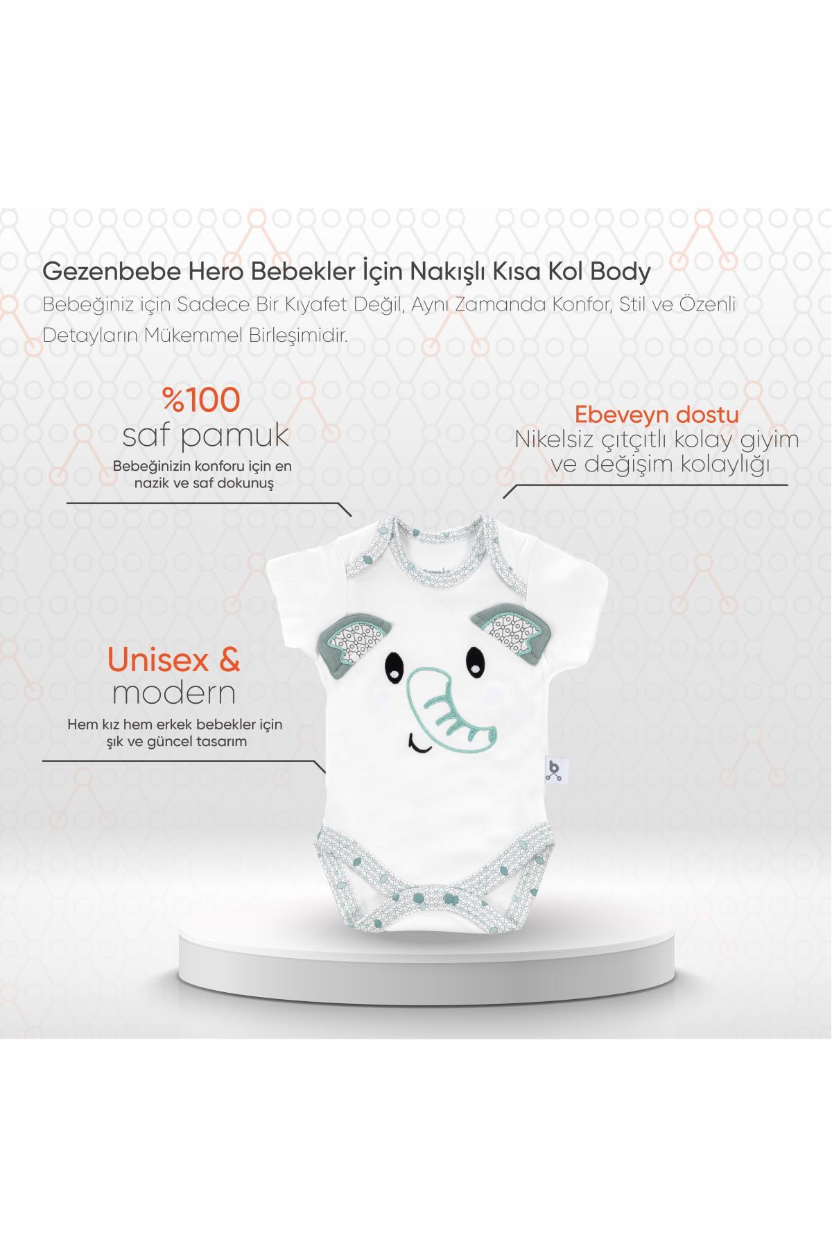 Gezenbebe Hero Bebekler İçin Nakışlı Kısa Kol Body: Bebeğinizin Narin Cildi İçin Özenle Hazırlandı - Gezenbebe'nin İmza Paterni, Sevilen Maskotları ve Zarif Nakış Detaylarıyla!